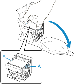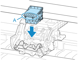 Ruotare in avanti i fori dell'inchiostro (A) e inserire la testina di stampa nel carrello.