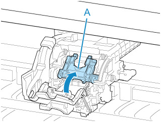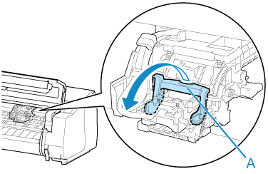 Afferrare la maniglia (A) e aprire il coperchio di bloccaggio della testina di stampa.