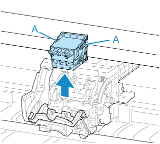 Afferrare le maniglie (A), rimuovere la testina di stampa e quindi toccare OK.