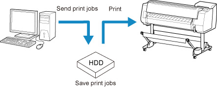 - I lavori per cui è stato specificato Stampa (Print) in Metodo di output (Output Method) vengono salvati nella casella lavori condivisa e classificati come lavori salvati.