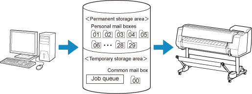 L'area di memorizzazione sul disco rigido della stampante è suddivisa in un'area di memorizzazione temporanea e in un'area di memorizzazione permanente. L'area di memorizzazione temporanea conserva i lavori di stampa nella coda dei lavori o nella casella lavori condivisa. L'area di memorizzazione permanente conserva i lavori nelle caselle personali.