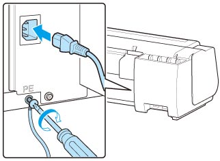 プリンター背面のアース端子に市販のドライバーを使ってアース線を取り付け、プリンター背面の電源コード接続部に電源コードを差し込む