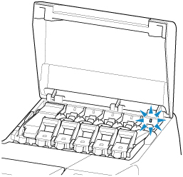 Armazene o cartucho de tinta removido com tinta restante na caixa com os orifícios de tinta (B) voltados para cima. Caso contrário, a tinta poderá vazar e causar manchas.
