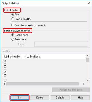 Clique em OK para fechar uma caixa de diálogo Método de saída (Output Method).