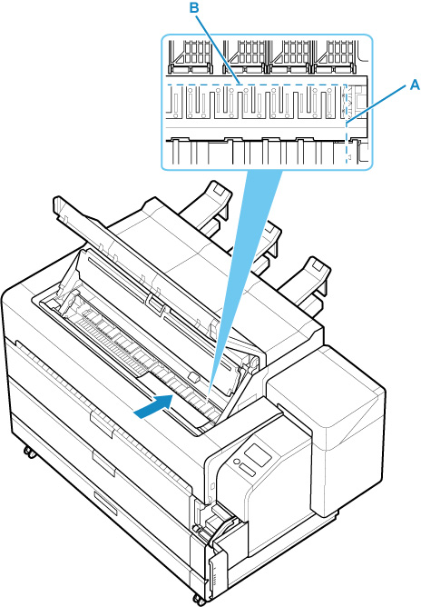 Cargue el papel manteniendo el borde derecho del mismo alineado con la línea extendida de la línea de alineación del papel (A) en el lado derecho de la impresora y la posición desde la cual empezar a imprimir alineada con la ranura (B) en el extremo de la placa.