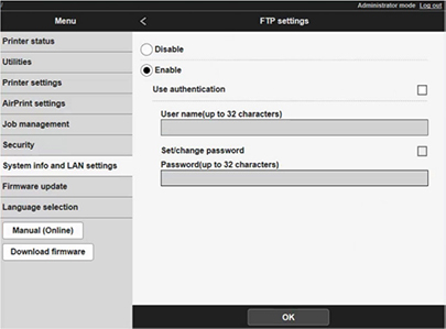 Utilice el mismo Nombre de usuario (User Name) y Contraseña (Password) que ha establecido para la autenticación de FTP de la IU remota.