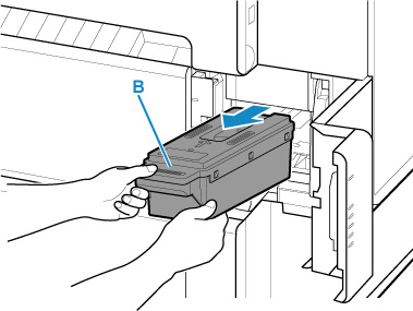 Tenez d'une main la cartouche d'entretien usagée par la poignée (B) et soutenez fermement la cartouche d'entretien de l'autre main par le dessous, en vous assurant qu'elle reste droite pendant que vous la retirez.