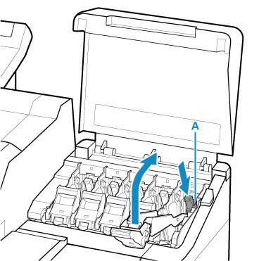 Spingere verso il basso la leva di rilascio (A) come mostrato nella figura, mentre si riporta delicatamente ogni leva di bloccaggio del serbatoio d'inchiostro nella posizione originale.