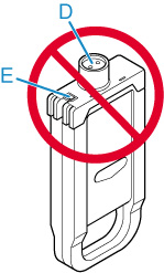 Non toccare mai i fori dell'inchiostro (D) o i contatti metallici (E). Tale azione potrebbe causare macchie, danneggiare il serbatoio d'inchiostro e influire sulla qualità di stampa.