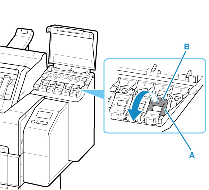 Tirare avanti la parte a maniglia (A) della leva di bloccaggio del serbatoio d'inchiostro del colore da sostituire mentre si preme il pulsante B.