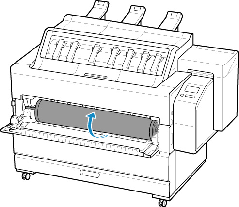 Com as duas mãos, gire o Suporte de rolo em direção à seta para rebobinar o rolo.