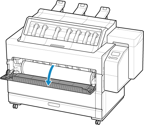 Não é possível remover o papel em rolo com a cesta em uso. Carregue a cesta e feche a gaveta de acessório.