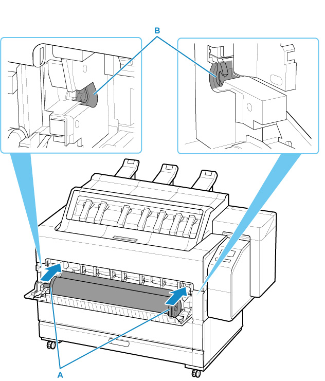 Segure a parte (A) dos flanges e ajuste o eixo do suporte do rolo de modo a alinhá-lo com as ranhuras (B) das guias do slot do suporte em rolo.