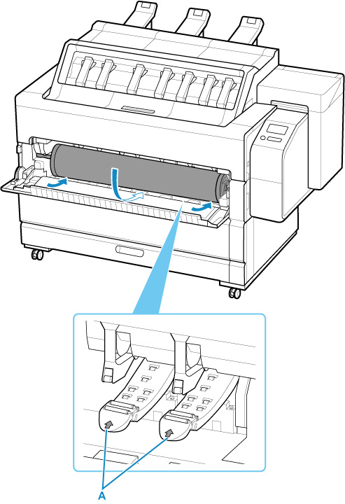 Segure os flanges (A) de modo que o fixador do suporte fique à esquerda e coloque cuidadosamente o suporte do rolo sobre a tampa aberta do rolo.