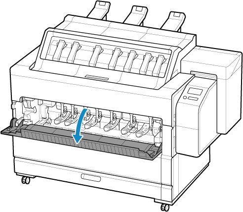 Antes de carregar um rolo, verifique se a parte interna da tampa interna ou da guia de saída frontal está suja. Se essas áreas estiverem sujas, recomendamos limpá-las antes. (Consulte "Limpeza da parte interna da tampa superior"). (Consulte "Limpeza da Parte Externa da Impressora)".