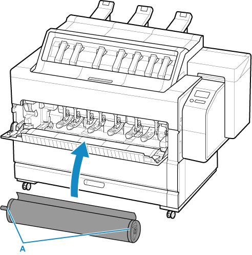 Para detalhes do procedimento de fixação do papel em rolo ao Suporte do rolo, consulte "Carregando Rolos no Suporte do Rolo".