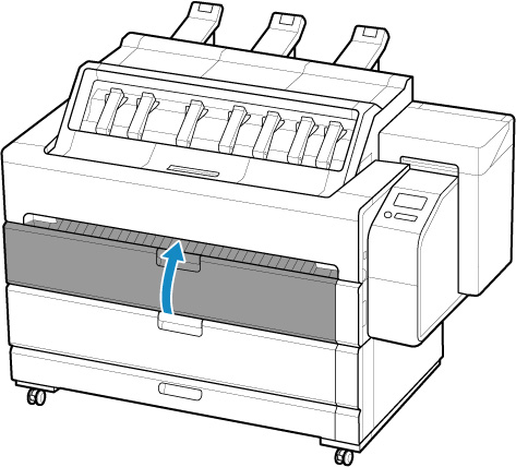 Dependendo do papel, o papel em rolo pode ser arranhado durante a alimentação e apresentar erro. Nesse caso, alimente o papel manualmente depois de configurar Configur. de retenção de papel (Paper retention settings) como Liberar (Release) na tela sensível ao toque. Erga a alavanca de liberação, avance o papel em rolo até que sua borda inicial apareça na exposição, abaixe a alavanca de liberação e avance para a etapa seguinte. Porém, se Configur. de retenção de papel (Paper retention settings) estiver definido como Liberar (Release), a troca automática dos rolos superior e inferior não será possível.