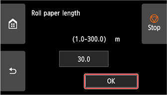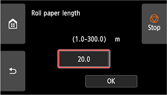 Toque no teclado que aparece na tela sensível ao toque, insira o comprimento do papel em rolo e toque em OK.