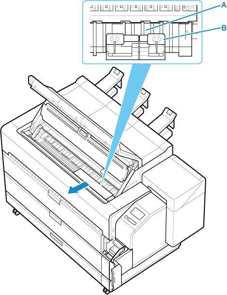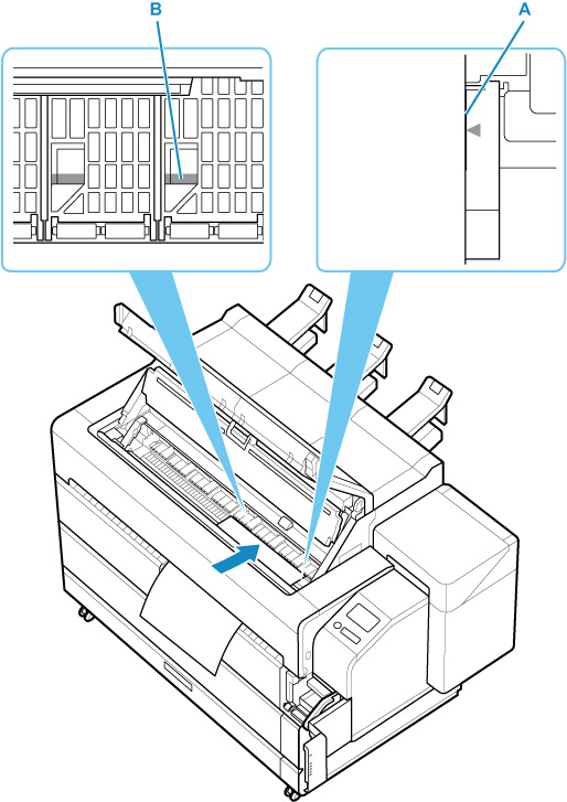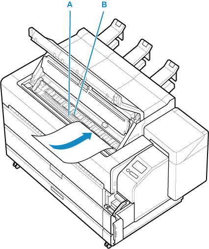 Coloque a folha cortada com o lado de impressão voltado para cima, insira a borda final da folha cortada entre o rolo pressor (A) e o retentor de papel (B).