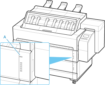 Verifique o indicador luminoso de alimentação (A) e o papel em rolo alimentado.