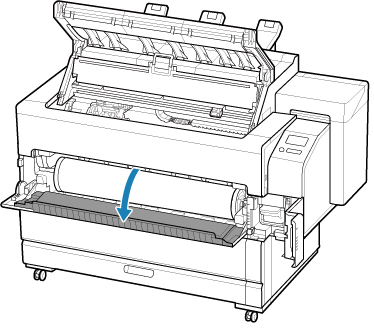 Não é possível colocar o papel em rolo com a cesta em uso. Puxe a cesta e feche a gaveta de acessório ao colocar o papel em rolo.