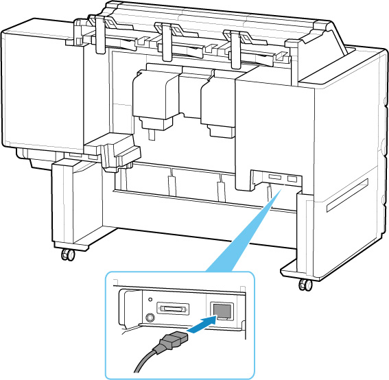Подключите шнур питания в разъем кабеля питания с задней стороны принтера.