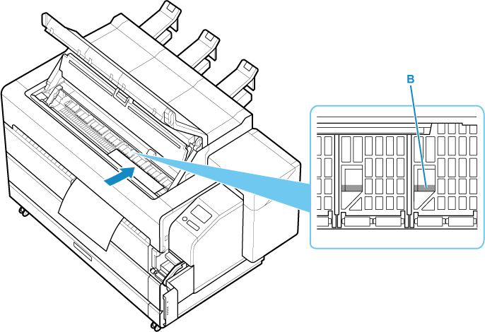 Allineare il bordo più lontano del foglio inserito con la linea allineamento carta per l'alloggiamento carta (B).