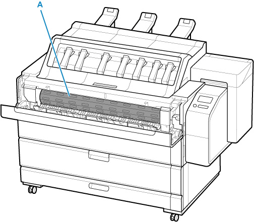 물기를 꼭 짠 천으로 운송 유닛 내부 커버의 내부(A)를 청소하십시오.