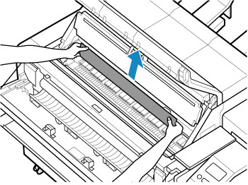 롤 용지가 심하게 말려 있는 경우와 같이 롤 용지의 가장자리가 캐리지에 걸린 경우 롤 용지 절단 방법을 사용자 절단(User cut)으로 설정하고 용지 끝 감지 기능을 감지 안 함(Do not detect)으로 설정하면 용지 걸림을 방지할 수 있습니다.