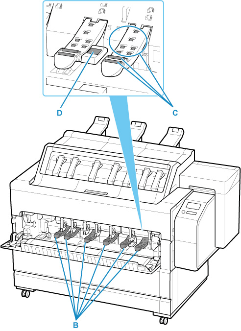 Elimine qualquer resíduo e pó de papel das áreas (B, C) que entram em contato com papel e o sensor (D) com um pano úmido completamente torcido.