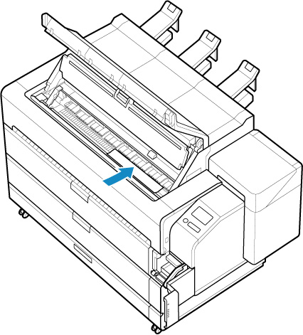 即使已将单页纸插入到压纸滚筒和纸张压板之间,该纸张也未固定在打印机上。 如果松开单页纸,可能会掉落到打印机内部。 放下释放杆之前,请勿松开单页纸。 如果单页纸掉落,请从打印机背面将其取出。