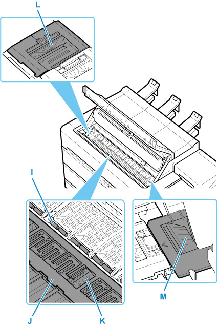 擦除纸张压板(I),整个压纸滚筒(J),无边界打印墨水槽(K),左右吸墨孔(L,M)等周围的所有墨水残留物和纸屑(切割碎屑)。