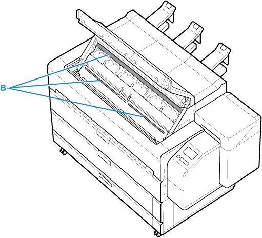 沿刷毛方向擦拭,以去除上端出纸托盘的刷子部分(B)上的污垢。 如果刷毛未对齐,则可能会影响纸张输出。