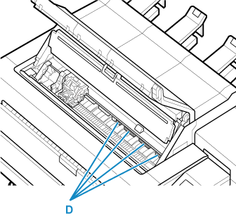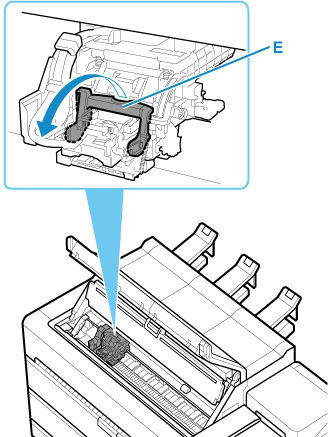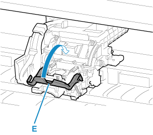 将手指放在打印头锁定杆的中心部分(E),然后向前倾斜。