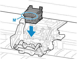 将墨水孔(M)转向前方,然后将打印头插入托架。