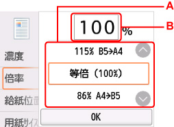 [倍率]の設定:[47% A4→はがき]/[70% A4→A5]/[86% A4→B5]/[115% B5→A4]/[141% A5→A4]/[200% はがき→A4]