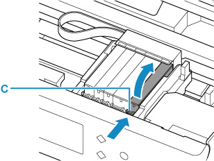 インクタンクの固定つまみ(C)を押し、インクタンクを上に持ち上げて外します。