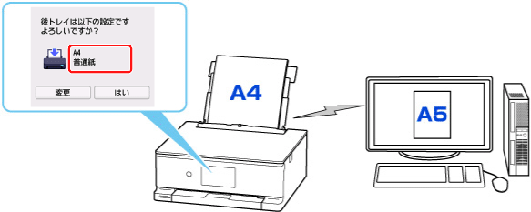 表示された用紙のサイズと種類が、後トレイにセットした用紙と同じであれば、[はい]を選びます。