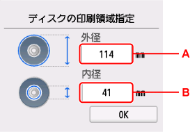 外径/内径の寸法は、プリンタブルディスクのパッケージやケース内のインデックスシートに記載されている印刷可能範囲(最小内径、最大外径)を確認するか、または印刷面の外径/内径を実際に測り、外径には計測した値より小さい数値を、内径には計測した値より大きい数値を指定してください。
