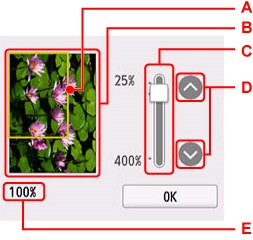 C:プレビュー画面を表示するときに設定しているコピー倍率が表示されます。[自動変倍]以外を選んでいるときは、ドラッグするとコピー倍率を変更することができます。