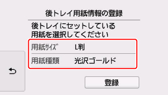 6. 後トレイにセットした用紙に合わせて[用紙サイズ]と[用紙種類]を設定し、[登録]を選ぶ