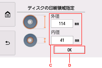 [外径]または[内径](C)を選び、印刷領域を設定して[OK](D)を選びます。