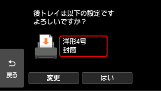 表示された用紙のサイズと種類が、後トレイにセットした封筒と同じであれば[はい]を選ぶ