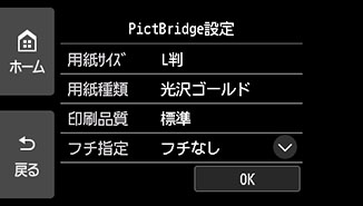 [PictBridge設定]画面が表示され、PictBridge(Wi-Fi)対応機器から写真を印刷するときの印刷設定を変更できます。