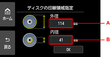 外径/内径の寸法は、プリンタブルディスクのパッケージやケース内のインデックスシートに記載されている印刷可能範囲(最小内径、最大外径)を確認するか、または印刷面の外径/内径を実際に測り、外径には計測した値より小さい数値を、内径には計測した値より大きい数値を指定してください。