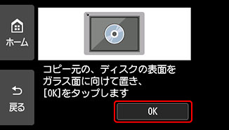 表示される案内に従って、コピー元のディスクを原稿台にセットし、[OK]を選ぶ
