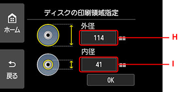 外径/内径の寸法は、プリンタブルディスクのパッケージやケース内のインデックスシートに記載されている印刷可能範囲(最小内径、最大外径)を確認するか、または印刷面の外径/内径を実際に測り、外径には計測した値より小さい数値を、内径には計測した値より大きい数値を指定してください。
