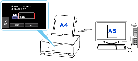 表示された用紙のサイズと種類が、後トレイにセットした用紙と同じであれば、[はい]を選びます。