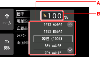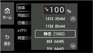 [倍率]の設定:[47% A4→はがき]/[70% A4→A5]/[86% A4→B5]/[115% B5→A4]/[141% A5→A4]/[200% はがき→A4]