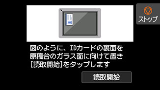 表示される案内に従ってIDカードの裏面を下に向けて原稿台にセットし、[読取開始]を選ぶ